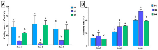 Feeding rate (A) and mortality rate (B) of L. vannamei fed on C. calcitrans (D1), T. weissflogii (D2), and or their mixture (D3) across different growth phases of the shrimp. Different small letters above the error bar indicate significant differences at p < 0.05.