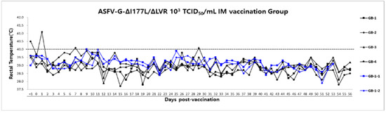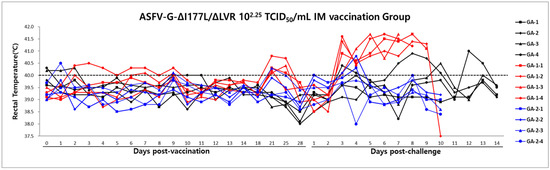 Group A (1–4) was intramuscularly immunized with a live attenuated ASFV-G-ΔI177L/ΔLVR vaccine at 102.25 TCID50/1mL/dose to confirm the safety and efficacy of this vaccine. As 28 dpv, 1 mL of a highly virulent homologous ASFV field strain (Hwacheon/2020) at 102 HAD50 was challenged by IM. No unusual temperature changes were observed in the animals at 28 dpv. A slight transient increase in body temperature (40.1–41.5 °C) was observed in three animals after the challenge, but all recovered (Figure 1) and no unusual clinical findings were noted before euthanasia.