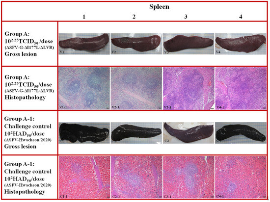 Group A: the spleen from a pig vaccinated with ASFV-G-ΔI177L/ΔLVR before viral challenge. Macroscopic lesions (V1 to V4): all spleens were normal in size and red in color. Microscopic lesions (V1-1 to V4-1): Sections of the spleen. H&E stain, 100x Normal histopathological findings were confirmed in all pigs challenged after vaccination. Group A-1: the spleen from a pig challenged with strain Hwacheon/2020. Macroscopic lesions (C1 to C4): the spleen shows an increase in size with round edges, along with friable (C1) and dark red to black color (C1 to C4). Microscopic lesions: Sections of the spleen (C1-1 to C4-1). H&E stain, 100x. Scale bar = 100 µm. Diffuse infiltration of the pulp by erythrocytes and macrophages showing severe lymphocytic depletion along with abundant pyknotic cells.