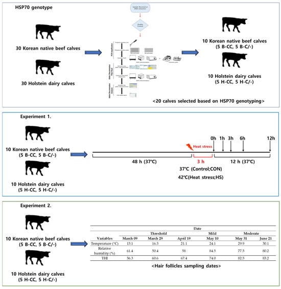 All the procedures involving animals were approved by the Institutional Animal Care and Use Committee (IACUC) of Konkuk University (Approval No: KU22151). Figure 1 illustrates the experimental design used to investigate the HSP70 genotype and the effects of HS on PBMCs and hair follicles.