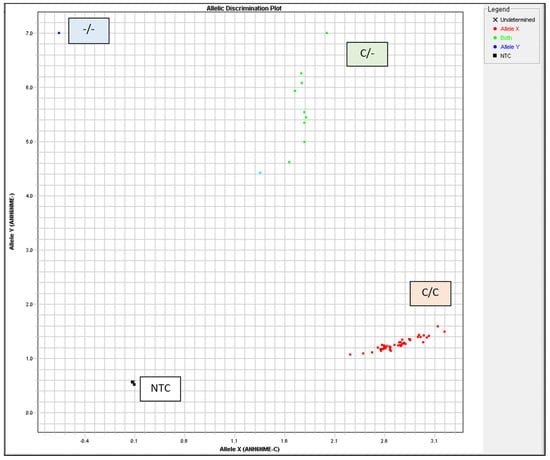 The TaqMan™ GTXpress™ Master Mix (Applied Biosystems, USA) was used in a 5 µL total reaction volume with 20 ng DNA per reaction. Thermal Cylcler was used for PCR with the following conditions: 95 °C for 2 min, 40 cycles of 3 s at 95 °C, and 30 s at 60 °C. Allelic discrimination was automatically assessed using the ABI Prism HT7900 system (Applied Biosystems) with Sequence Detection System 2.4 software (Applied Biosystems). The autocaller confidence level was 95%. All measurements were visually examined and validated using allelic discrimination plots (cluster plots) (Figure 2, Table 2).