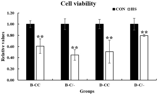 Cell viability was assessed using the CCK-8 assay to investigate the effects of HS on the proliferation of PBMCs. Cell proliferation significantly decreased (p < 0.01) in all HS-treated groups (B-CC, B-C/-, D-CC, and D-C/-) compared with that of the CON groups after 3 h of HS (Figure 4).