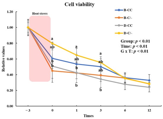 Effects of different heat shock protein 70 genotypes and times on cell proliferation in peripheral blood mononuclear cells (PBMCs) in beef and dairy calves. Cell viability was measured via Cell Counting Kit-8 (CCK-8) assay. Data are presented as means ± standard deviations (n = 5 for each group). p-values were determined using two-way ANOVA. a,b Means with different superscripts differ significantly (p < 0.05) within groups based on Tukey’s honestly significant difference (HSD) test. ANOVA, analysis of variance; B-CC, beef calves HSP70 CC type; B-C/-, beef calves HSP70 C/-type; D-CC, dairy calves HSP70 CC type; D-C/-, dairy calves HSP70 C/-type.