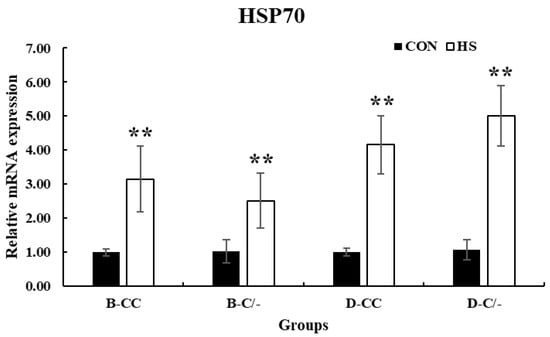 The expression of HSP70 significantly increased (p < 0.01) in all HS-treated groups (B-CC, B-C/-, D-CC, and D-C/-) compared with that in the CON groups after 3 h of HS (Figure 6).