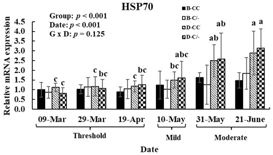 Gene expression level of heat shock protein 70 (HSP70) in hair follicles after exposure to various temperature–humidity index (THI) levels in beef and dairy calves. Data are presented as means ± standard deviations (n = 5 for each group). p-values were determined using two-way ANOVA. a,b,c Means with different superscripts differ significantly (p < 0.05) within groups based on Tukey’s honestly significant difference (HSD) test. ANOVA, analysis of variance; B-CC, beef calves HSP70 CC type; B-C/-, beef calves HSP70 C/-type; D-CC, dairy calves HSP70 CC type; D-C/-, dairy calves HSP70 C/-type.