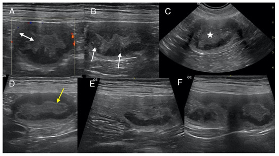 Ultrasound scans of the uterus obtained using a linear probe on the 32nd (A,B,D–F) and microconvex probe on the 38th (C) day after mating. The examination revealed ampullary dilatation of the uterine horns; transverse sections (A–C) and sagittal sections (D–F). Thickening and irregularities of the endometrium are visible (double-headed arrow), as well as few hyperechoic foci and streaks (arrows). The inner layer of the endometrium adjacent to the lumen is hyperechoic (yellow arrow). The presence of hyperechoic fluid content can be seen in the lumen in the thickened part of the uterus (asterisk). Visible vascularization of the uterine wall (A). The image of the left horn shows adjacent areas of thickening (F) without narrowing, and in the right horn, there is a clear demarcation from the normal part of the horn (E).