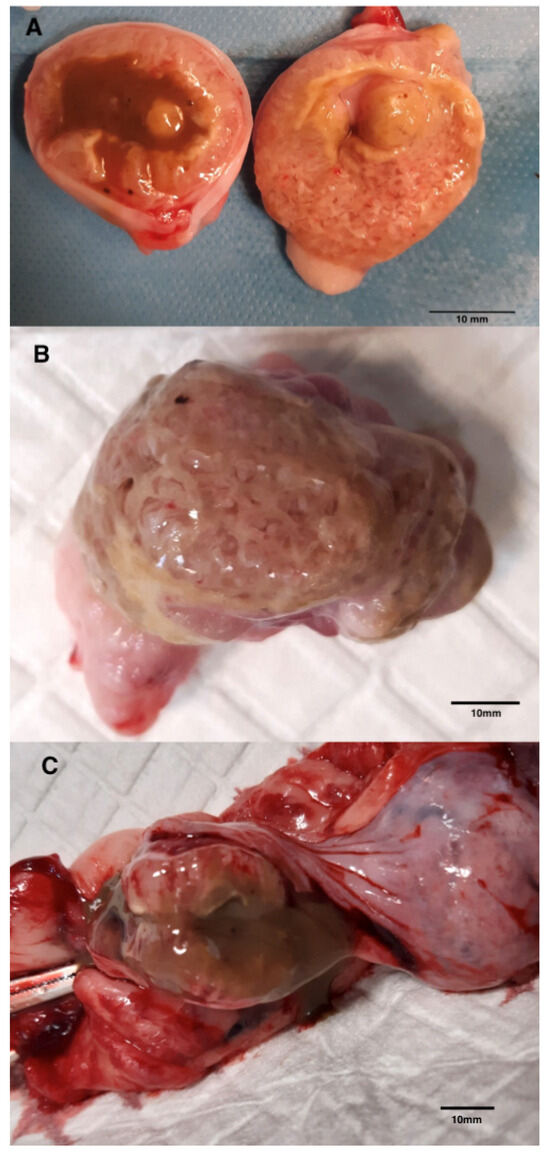 The bitch underwent an ovariohysterectomy on the 38th day after mating. Upon visual examination, there were distinct, pliable, and spherically shaped masses ranging between approximately 2 cm and 3.6 cm in size in both uterine horns (Figure 2 and Figure 3). The enlargement of the ovaries corresponded with the ultrasonographic findings. A swab was taken for microbiological examination from the fluid present in the uterine cavity. There was no bacterial growth detected, although the antibiotic was discontinued 6 days prior to sample collection.