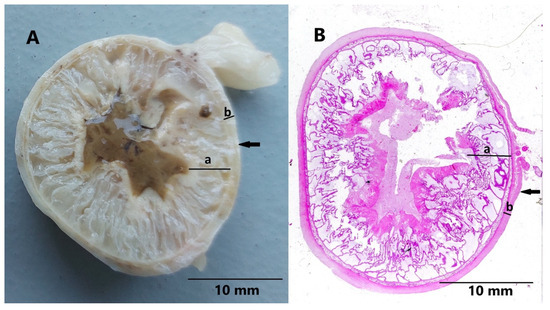 (A) Cross-section of the altered segment of uterine horn fixed in formalin. (B) Microscopic view of the transverse section of the affected uterine horn segment presenting distension of the uterus with mucosal proliferations forming long projections, and uterine lumen filled with proteinaceous material; moreover, endometrium (a), myometrium (b), and perimetrium (arrow) are visible in both figures; hematoxylin–eosin staining, magnification 10×.