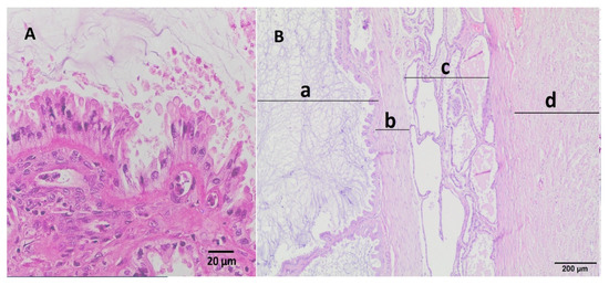 (A) Histopathological structure of inner surface of mucosa with uterine mucosal projections covered by a layer of cuboidal or columnar epithelium, uterine lumen is visible at the top of figure; hematoxylin–eosin staining, magnification 40×. (B) Microscopic view showing three layers of the uterine mucosa, including (a) villous folds (projections) of the mucosa covered by endometrial epithelium separated by proteinaceous material, (b) a thin band of fibrous connective tissue, (c) distended endometrial glands commonly filled with proteinaceous fluid, and (d) myometrium; hematoxylin–eosin staining, magnification 20×.