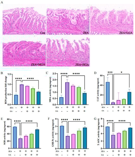 3.1. GA Alleviates ZEA-Induced Tissue Damage and Oxidative Stress