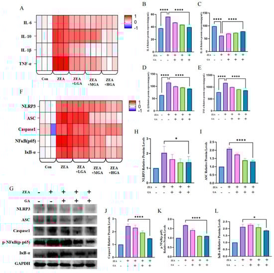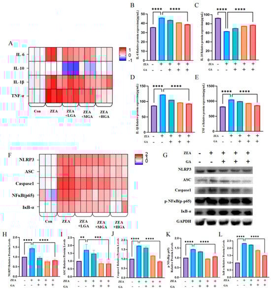 Effects of ZEA exposure and GA on glandular gastric inflammation and the NFκB/IκB−α−signaling pathway in chickens. (A) mRNA levels of IL-6, IL-10, IL-1β, and TNF-α (n = 3). (B) Protein expression of IL−6 (n = 10). (C) Expression of IL−10 protein (n = 10). (D) Protein expression of IL−1β (n = 10). (E) Protein expression of TNF-α (n = 10). (F) mRNA levels of NLRP3, ASC, Caspase1, NFκB p65, and IκB−α (n = 3). (G) Western blot images of proteins associated with the NFκB/IκB−α−signaling pathway (n = 10). (H) NLRP3 protein expression (n = 10). (I) Protein expression of ASC (n = 10). (J) Protein expression of Caspase1 (n = 10). (K) Protein expression of p−NFκB (n = 10). (L) Protein expression of IκB−α (n = 10). * Means with different superscripts within the same column differ (p < 0.05). **** Means with different superscripts within the same column differ (p < 0.001).