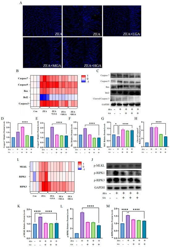 Effect of GA intervention on ZEA−induced cell death. (A) TUNEL−positive cells are stained green. Scale bar = 50. (B) mRNA levels of Caspase7, Caspase9, Bax, Bcl2, and Caspase3 (n = 3). (C) Protein immunoblot images of Caspase7, Caspase9, Bax, Bcl2, and Caspase3 (n = 10). (D) Protein expression of Caspase7 (n = 10). (E) Protein expression of Caspase9 (n = 10). (F) Protein expression of Bax (n = 10). (G) Protein expression of Bcl2 (n = 10). (H) Cleaved Caspase3 protein expression (n = 10). (I) mRNA levels of RIPK1, RIPK3, and MLKL (n = 3). (J) Western blot images of p−MLKL, p−RIPK1, and p−RIPK3 (n = 10). (K) Protein expression of p−MLKL (n = 10). (L) Expression of p−RIPK1 protein (n = 10). (M) Protein expression of p−RIPK3 (n = 10). * Means with different superscripts within the same column differ (p < 0.05). **** Means with different superscripts within the same column differ (p < 0.001).