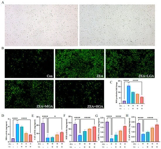 Effects of GA on ZEA−induced oxidative stress on chicken gastric gland epithelial cells. (A) Isolation and culture of chicken glandular gastric epithelial cells. (B) ROS staining of chicken glandular gastric epithelial cells under different concentrations of GA. (C−H) Effects of control group and different concentrations of GA on oxidative stress of chicken glandular gastric epithelial cells (n = 10). * Means with different superscripts within the same column differ (p < 0.05). **** Means with different superscripts within the same column differ (p < 0.001).