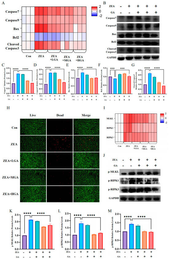 To verify that GA can reduce ZEA-induced apoptosis in chicken glandular gastric epithelial cells, we examined the expression levels of the Caspase7, Caspase9, Bax, Bcl2, and Cleaved Caspase3 genes. The results showed that ZEA exposure significantly increased the expression of Caspase7, Caspase9, Bax, and Cleaved Caspase3 and decreased the expression of the Bcl2 gene (Figure 6A). At the same time, the expression results were verified at the protein level, and the results were identical to those obtained for their respective genes. ZEA exposure upregulated the protein levels of Caspase7, Caspase9, Bax, Bcl2, and Cleaved Caspase3. GA intervention resulted in dose-dependent decreases in the expression of the Caspase7, Caspase9, Bax, Bcl2, and Cleaved Caspase3 proteins (p < 0.005) (Figure 6B–G). Then, AOEB staining was performed to detect the number of live and dead cells within the cells. As shown in the figure, the number of dead cells increased significantly after ZEA exposure, and GA could effectively alleviate cell death caused by ZEA (Figure 6H). Subsequently, we tested the expression levels of the MLKL, RIPK1, and RIPK3 genes, and the results showed that ZEA exposure significantly increased the expression levels of the MLKL, RIPK1, and RIPK3 genes, but they also showed that, after the addition of GA, the expression levels of the MLKL, RIPK1, and RIPK3 genes were significantly reduced (Figure 6I). To further verify the above results, a Western blot was conducted to detect the expression levels of p-MLKL, p-RIPK1, and p-RIPK3. At the protein level, the expression level of necrosis factor protein was basically consistent with the mRNA expression level (Figure 6J–M).