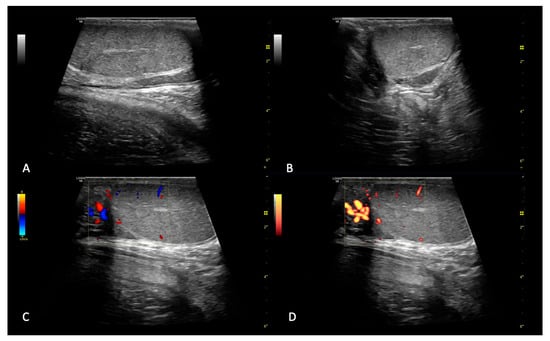 Example of B-mode and color Doppler examination. In panels (A,B), respectively, longitudinal and transverse testicle sections are reported; note the medium level of ecogenicity with a homogeneous, medium–coarse echostructure and smooth margins. In panels (C,D), respectively, color and power Doppler on a longitudinal testicular section are reported, with normal parenchymal and epididymal vascularization.