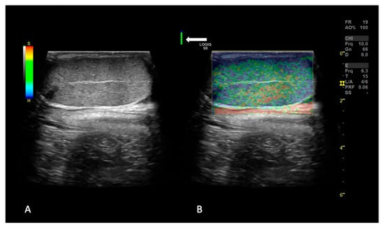 Example of strain elastographic image of a testis on the longitudinal section. The dual-mode, real-time, biplane elasto-mode shows the B-mode image on the left side (panel (A)) and elastographic image on the right side (panel (B)); the testis shows a predominantly green/blue pattern (type III). The acquired appropriate compression force and frequency of elastography are monitored using a color scale, with green color indicating the correct compression applied (white arrow).