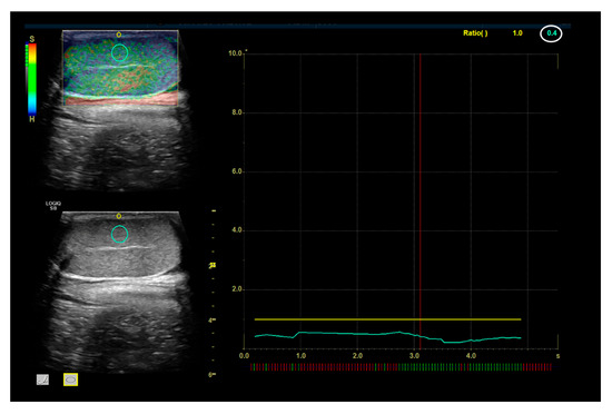 SE is based on measuring the grade of strain produced by the operator who manually executes rhythmic and regular compressions with the probe in the area of interest that is deformed proportionally to its elasticity; the elasticity can be visually assessed evaluating a color map or semiquantitatively comparing the relative deformation of the tissue with a reference one, with a specific parameter called the strain ratio (SR). A SR < 1 shows that the studied tissue is softer than the reference one and the opposite if the SR is >1 [6,7].
