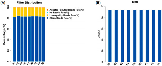 Filter distribution (A) and Q30 quality control (B). (NC group: N1, N2, N3; HS group: H1, H2, H3; PF group: P1, P2, P3).