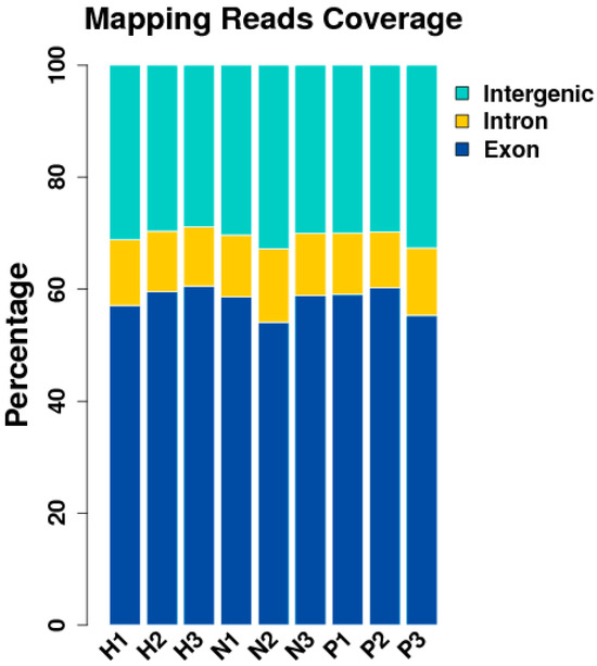 After quality control, Tophat software was employed to align the 51 to 60 million (M) clean reads onto the reference chicken genome (GRCg6a) with a tolerance of 2 bp mismatches [19]. About 79.66 to 92.90% of reads were mapped to the chicken reference genome, of which 71.90 to 78.50% were located in annotated exons, 6.80 to 10.30% were assigned to introns, and the remaining 14.60 to 17.70% fell in intergenic regions (GRCg6a) (Figure 3).