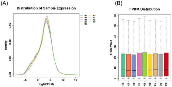 Distribution of nine samples of expression ((A), distribution of samples expression; (B), FPKM distribution. NC group: N1, N2, N3; HS group: H1, H2, H3; PF group: P1, P2, P3).