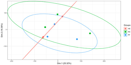 The PCA of three groups (NC, normal control group; HS, heat stress group; PF, pair feed group. Dim.1, dimension1; Dim.2, dimension2).