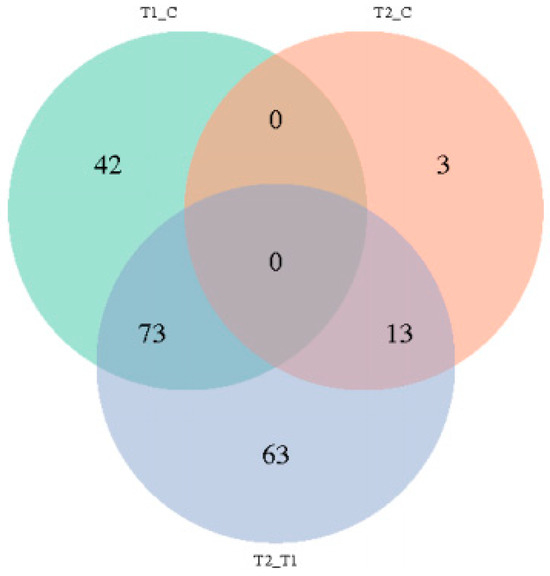 The Venn diagram of differentially expressed genes among the three groups. (T1, heat stress group; T2, pair feed group; C, normal control group).