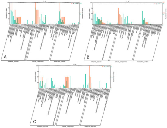 GO statistical bar chart of differentially expressed gene clusters among the three groups ((A), HS vs. NC; (B), HS vs. PF; (C), PF vs. NC).