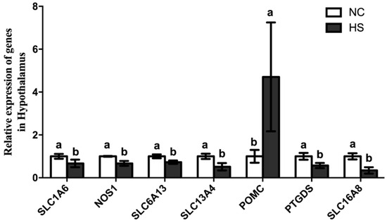 The expression of differentially expressed genes in qPCR between the HS and NC groups. Note: a,b represents a significant difference in the expression of the genes between the HS and NC groups (p < 0.05). SLC1A6, solute carrier family 1 member 6; NOS1, nitric oxide synthase 1; SLC6A13, solute carrier family 6 member 13; SLC13A4, solute carrier family 13 member 4; POMC, pro-opiomelanocortin; PTGDS stands for prostaglandin D2 synthase; SLC16A8, solute carrier family 16 member 8.