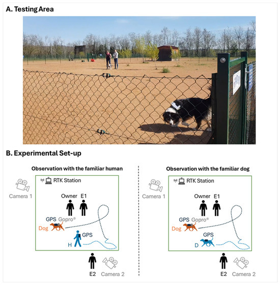 This study was conducted in accordance with the Declaration of Helsinki of 1975, which was revised in 2013, the French regulations for animal welfare (Rural Code Article R214-17 and the official French Legal Code of Animals, 2018), the institutional guidelines of Aix-Marseille University, and the internal regulations of the dog club Agility du Gier, in Saint-Joseph, France, where the study was carried out. The study was exempt from ethical approval because it was conducted with privately owned pet dogs without any physical constraints or invasive samplings. All dog owners were recruited on a voluntary basis and signed an informed consent form. All the dogs were in good health, with no signs of aging or behavioural problems, based on information from the owners and observations by the experimenters. Data collection took place in March and April 2024 at the canine club, a familiar environment for the dogs that regularly attended sessions there. Each dog was given 5 to 10 min prior to the observations to get acquainted with the GPS equipment and was free to move around the testing area throughout the entire experimental procedure. The dog’s owner always remained within the dog’s sight, and we visually controlled for stress-associated behaviours. During the experiment, none of the dogs exhibited any stress or fear signals.