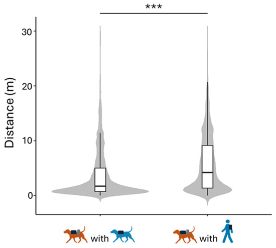The null–full model comparison for the distance was significant (LRT: χ2 = 14.10, df = 3, p = 0.003). The distance was smaller when the dogs were with the FD than when they were with the FP (Table 2 and Figure 3).