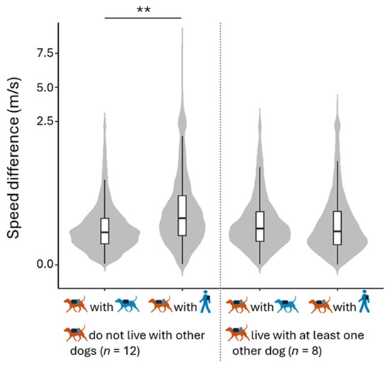 Effect of interaction between type of agent present and presence of another dog in the household on speed difference. With FD and with FP conditions are depicted in blue; the dogs are depicted in brown. For dogs that do not live with other dogs, the speed difference between the dogs and FD was significantly smaller than between the dogs and the FP. Data exceeding 2.5 m/s were squashed. ** 0.001 ≤ p ≤ 0.01.