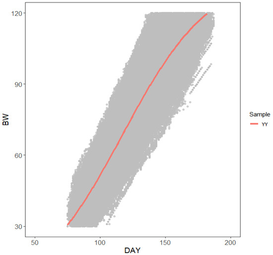 In this study, we constructed a multiple regression model using FT and BW to correct for abnormal FI. The results of the FI correction indicated a marginal R-squared value of 0.87 and conditional R-squared value of 0.91. Furthermore, the calculated mean daily FI of Yorkshire boars was 2.35 kg/day. The robust regression analysis of individual animals revealed that the average R-squared value for the regression between BW and DAY was 0.962, with a maximum value of 0.997 and a minimum value of 0.801. After performing a robust regression analysis, BW data were used to construct a logistic growth model. The fitting results are shown in Figure 1. The modeled logistic curves showed that Yorkshire boar breeds exhibited the classic S-growth curve, with a growth rate characterized as “Slow-Fast-Slow”. The modeled logistic formula indicated that the number of days at which the Yorkshire populations reached their median BW was 117.17 days, with a corresponding BW of 63.67 kg. Phenotypic processing results are listed in Table 3.