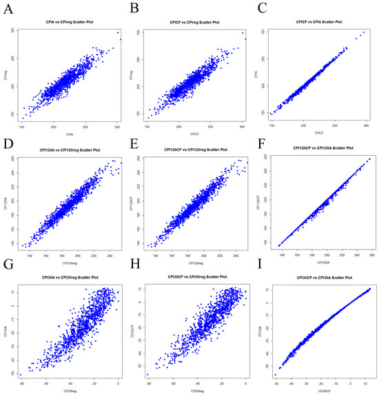 The validation results for the correction formula in the validation group are shown in Figure 4. In the new group, the correlation coefficients between the corrected CFICF, CFIA, and CFIreg were 0.95 and 0.94. This further validates the feasibility of the model.