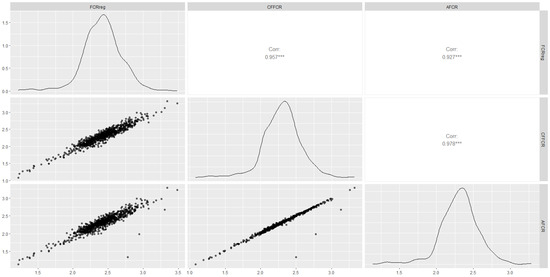 Pairwise matrix plot of the correlation between corrected FCR and true FCR in the validation population of 150 boars. The lower left corner shows scatter plots of AFCR and CFFCR versus the true FCR values. The diagonal presents density plots of AFCR and CFFCR versus true FCR values. The upper right corner displays the correlation coefficients and significance levels between AFCR, CFFCR, and true FCR values. *** indicates highly significant, p < 0.001.