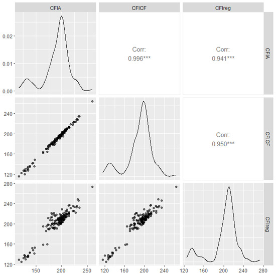Pairwise matrix plot of the correlation between corrected CFI and CFIreg in the validation population. The lower left corner shows scatter plots of ACFI and CFCFI versus the CFIreg. The diagonal presents density plots of ACFI and CFCFI versus CFIreg. The upper right corner displays the correlation coefficients and significance levels between ACFI, CFCFI, and CFIreg in the validation population. *** indicates highly significant, p < 0.001.