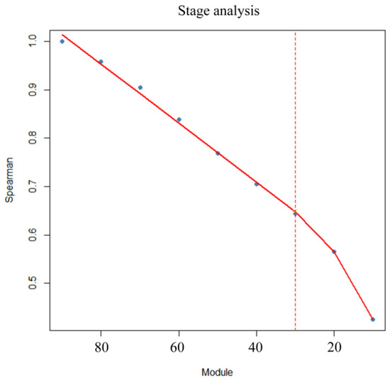 Stage division results. The x-axis represents the weight range within each module, while the y-axis represents the average Spearman correlation coefficient between the FCR under each module and the FCR for the weight range of 30–120 kg.