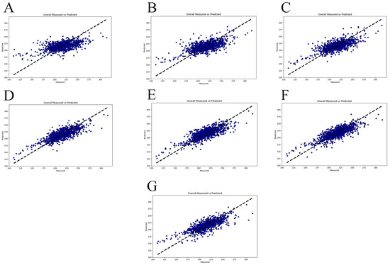 Scatter plots of module-predicted CFI vs. CFIreg. (A–G) display scatter plots of predicted CFI values versus CFIreg values for different modules. Each subplot represents a specific module size: 30–60 kg, 40–70 kg, 50–80 kg, 60–90 kg, 70–100 kg, 80–110 kg, and 90–120 kg, respectively. The horizontal axis represents the CFIreg values, and the vertical axis shows the CFI values predicted by the module.
