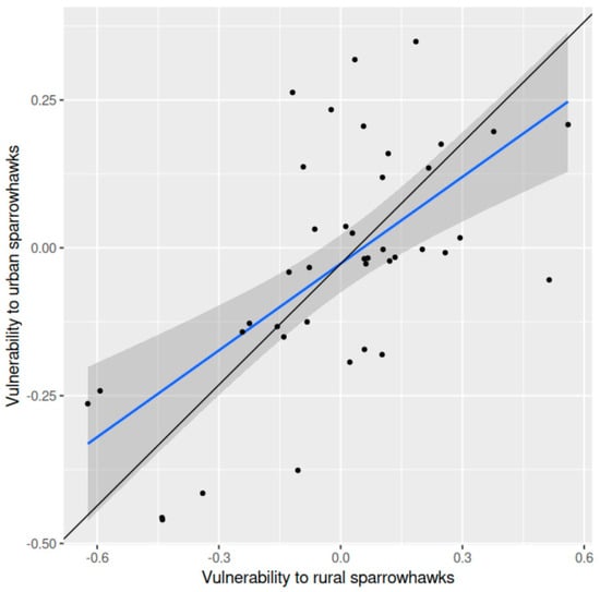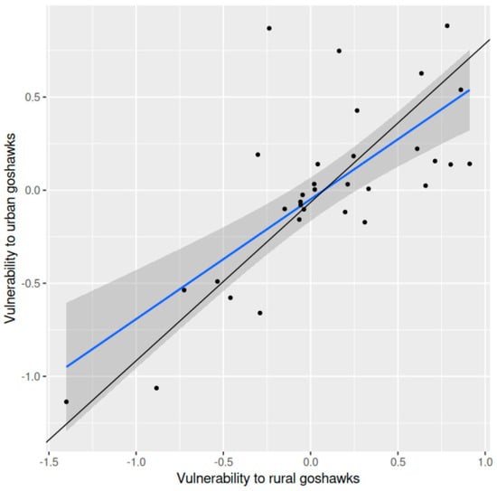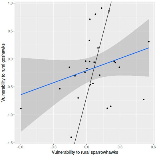 Vulnerability of shared prey species to goshawk predation in a rural landscape in relation to vulnerability to goshawk predation in a peri-urban area in southern Finland: theordinary regression line (blue) fitted to the data (points), the 95% confidence band (grey) and the orthogonal regression line (black) (f(x) = 0.851x − 0.065; confidence intervals, slope 0.604–1.143, intercept −0.163–0.058) are shown.