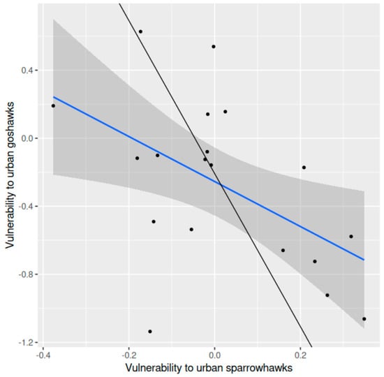 Vulnerability of shared prey species to sparrowhawk predation in the peri-urban landscape was significantly negatively related to vulnerability to goshawk predation in the same district (r = −0.513, df = 17, p = 0.025, two-tailed) (Figure 4). The average difference in vulnerability to predation between sparrowhawk and goshawk was not statistically significant (0.289 (±0.143 SE), t = 2.02, df = 18, p = 0.060, two-tailed).