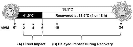 Cumulus–oocyte complexes with compact cumulus vestments and homogenous ooplasm underwent in vitro maturation in polystyrene tubes; Sarstedt AG and Co. Nümbrecht, Germany). Per each oocyte collection day (i.e., experimental replicate), COCs (n = 35 per 0.5 mL maturation medium; experimental unit) were cultured at 38.5 °C (thermoneutral) for 2, 4, 6, 10, or 24 hIVM (Figure 1). To examine the direct impact of a physiologically relevant elevated temperature, COCs were exposed to 41 °C for 2, 4, or 6 hIVM. To examine the possible delayed impacts, COCs were cultured at 41 °C for 6 hIVM and then transferred to 38.5 °C for an additional 4 h (10 hIVM total) or 18 h (24 hIVM total) of recovery. This ultimately resulted in a 2 × 5 factorial treatment arrangement. Whenever sufficient numbers were available (5 of the 6 days of COC collection), a subset of COCs was also processed soon after removal from antral follicles to provide a 0 hIVM group. Incubator temperatures were validated using internal mercury thermometers.