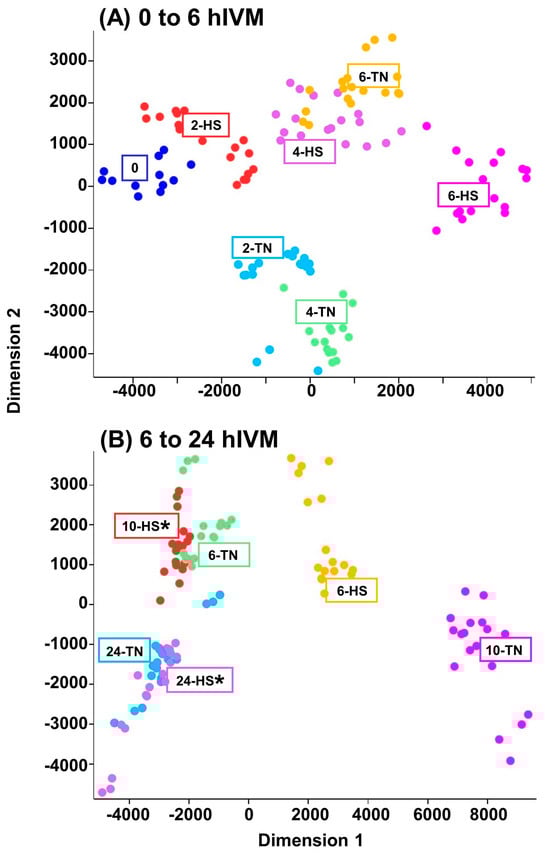 Multidimensional scaling plots representing each in vitro maturation time and temperature treatment combination and performed in triplicate are provided in Figure 2. Differences in clustering related to time and temperature in early maturation were apparent. Interestingly, and relevant for the first 6 hIVM, samples originating from COCs directly exposed to 41 °C for 4 hIVM overlapped with those matured at 38.5 °C for 6 hIVM (Figure 2A). When allowed to recover at 38.5 °C for 4 h, samples originating from COCs directly exposed to 41 °C for 6 hIVM (10-HS in Figure 2) began to overlap with those matured at 38.5 °C for 6 hIVM (Figure 2B). Samples from COCs directly exposed to 6 h of 41 °C but not allowed any recovery time clustered between those originating from COCs matured at 38.5 °C for 6 and 10 hIVM. By 24 hIVM, however, samples from COCs matured at 38.5 °C (24-TN in Figure 2) versus those that were directly exposed to 41.0 °C for the first 6 hIVM but allowed to recover for a total of 18 h at 38.5 °C (24-HS in Figure 2) clustered with the most overlap (Figure 2B).