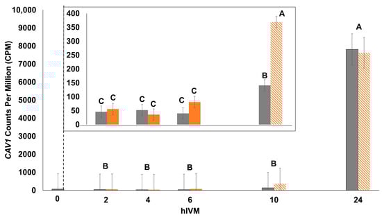 Impact of 41.0 °C exposure during the first 6 hIVM on CAV1 count per million (CPM) of cumulus–oocyte complex (COC). COCs were cultured at 41.0 °C for 2, 4, or 6 hIVM (orange bars), or allowed to recover at 38.5 °C for an additional 4 h (10 hIVM) or 18 h (24 hIVM; hashed bars as indicated by 41 °C). Thermoneutral COCs were cultured at 38.5 °C for 2, 4, 6, 10, or 24 hIVM (gray bars). Bars (least squares means ± SEM) with different letters differ significantly for hIVM. Temperature and the interaction of maturation temperature and hIVM was not significant. The inset reflects differences when data were analyzed with only the 2, 4, 6, and 10 hIVM timepoints. Bars with different letters (i.e., A through C) through differ significantly for the interaction of maturation temperature and hIVM. COCs at 0 hIVM were included as a reference.