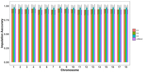 Imputation accuracy for each chromosome in Rongchang pigs. The imputation accuracy at various thresholds—0.3, 0.6, 0.9, and before filtering.