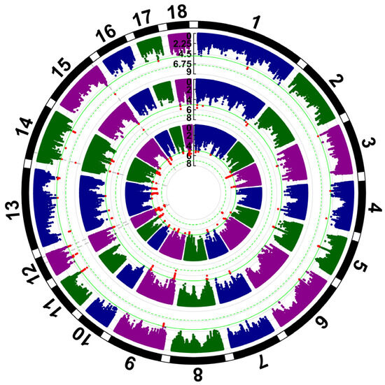 GWAS result for litter weight (LW), total number of piglets born (TNB), and number of piglets born alive (NBA) in Rongchang pigs. LW, TNB, and NBA are shown from inside to outside. Red sites indicate sites used for the weighting of each trait (p < 1 × 10−5). The numbers on the outer ring indicate chromosomes and the numbers on the central axis indicate −log10(P).
