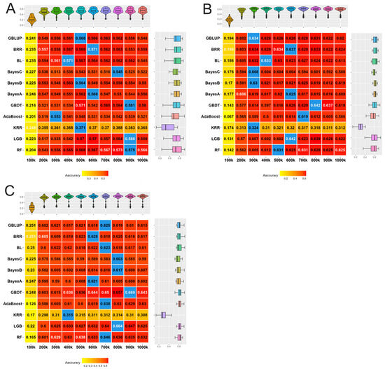 The genomic prediction accuracy of different methods for litter weight (LW), total number of piglets born (TNB), and number of piglets born alive (NBA) in Rongchang pigs. (A) The genomic prediction accuracy of LW. (B) The genomic prediction accuracy of TNB. (C) The genomic prediction accuracy of NBA. The redder the cell, the more accurate the prediction; white text: the highest predictive accuracy of each quantity; blue cell: the highest predictive accuracy of each method. The box plots show the median and distribution of accuracy for each method (right) and the violin plots show the same for each quantity (top).