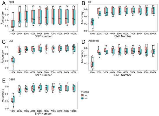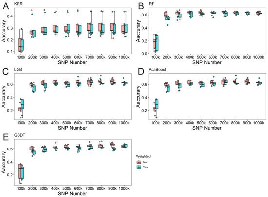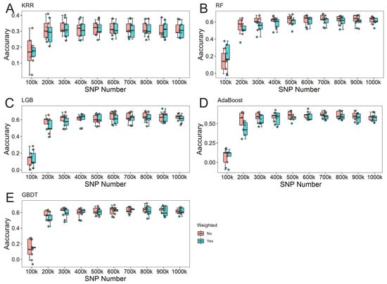 Results comparing weighted and unweighted predictions for litter weight (LW) in Rongchang pigs. (A) The predictive results of KRR. (B) The predictive results of RF. (C) The predictive results of LightGBM. (D) The predictive results of Adaboost. (E) The predictive results of GBDT.