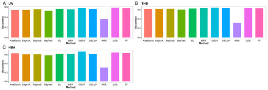 The predictive accuracy of different methods during the independent test for litter weight (LW), total number of piglets born (TNB), and number of piglets born alive (NBA) with the best results in Rongchang pigs. (A) The predictive accuracy of LW with different methods. (B) The predictive accuracy of TNB with different methods. (C) The predictive accuracy of NBA with different methods.