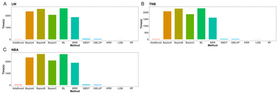The computational efficiency of different methods for litter weight (LW), total number of piglets born (TNB), and number of piglets born alive (NBA) with the best results in Rongchang pigs. (A) The computational efficiency of LW with different methods. (B) The computational efficiency of TNB with different methods. (C) The computational efficiency of NBA with different methods.