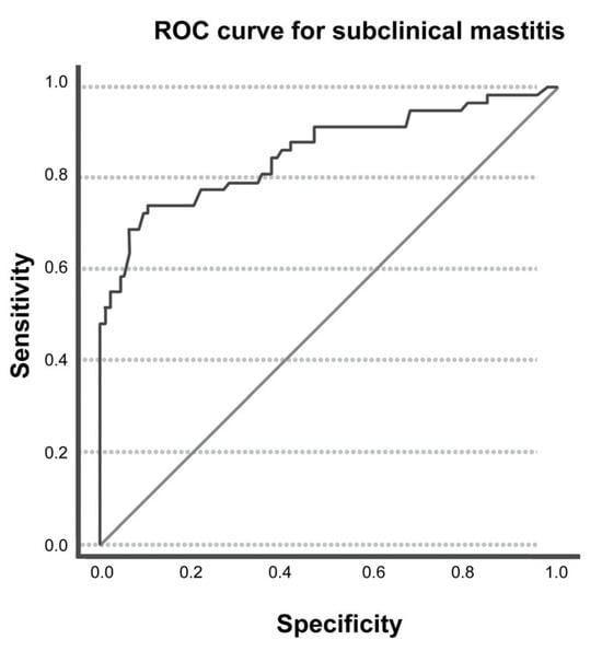 Receiver operating characteristic (ROC) and area under the curve (AUC) for the optimal threshold of ADMA to distinguish between the presence and absence of subclinical mastitis.