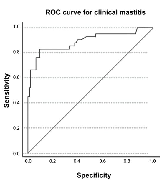 For biomarkers that were statistically different between healthy animals and those with mastitis, a cut-off was calculated using the ROC (Receiver Operating Characteristic) curve divided between subclinical and clinical mastitis. The optimal cut-off was chosen using the Youden index, in which the sensitivity and specificity are maximized, with equal weight given to false positive and false negative results [38]. The calculated cut-off values were then used to determine sensitivity (Se), specificity (Sp), positive predictive value (PPV), negative predictive value (NPV), and test accuracy. Additionally, the area under the curve (AUC) and its 95% confidence interval (CI) were calculated and used as indicators of biomarker accuracy. The interpretation of the AUC is based on 1.00 for a perfect test, 0.99–0.90 for an excellent test, 0.89–0.80 for a good test, 0.79–0.70 for a fair test, 0.69–0.51 for a poor test, and 0.50 for a failed test [39].